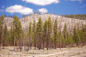 Resultado de un incendio de superficie: mueren arbustos y pequeños árboles, pero los más grandes sobreviven