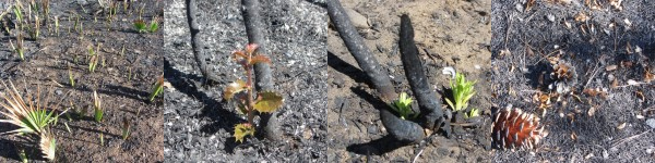 | Rebrotes de palmito (Chamaerops humilis), coscoja (Quercus coccifera) y torvisco (Daphne gnidium), y dispersión de semillas de pino carrasco (Pinus halepensis), 15 días después del incendio de Dos Aguas. Imagen por cortesía de J.G. Pausas |